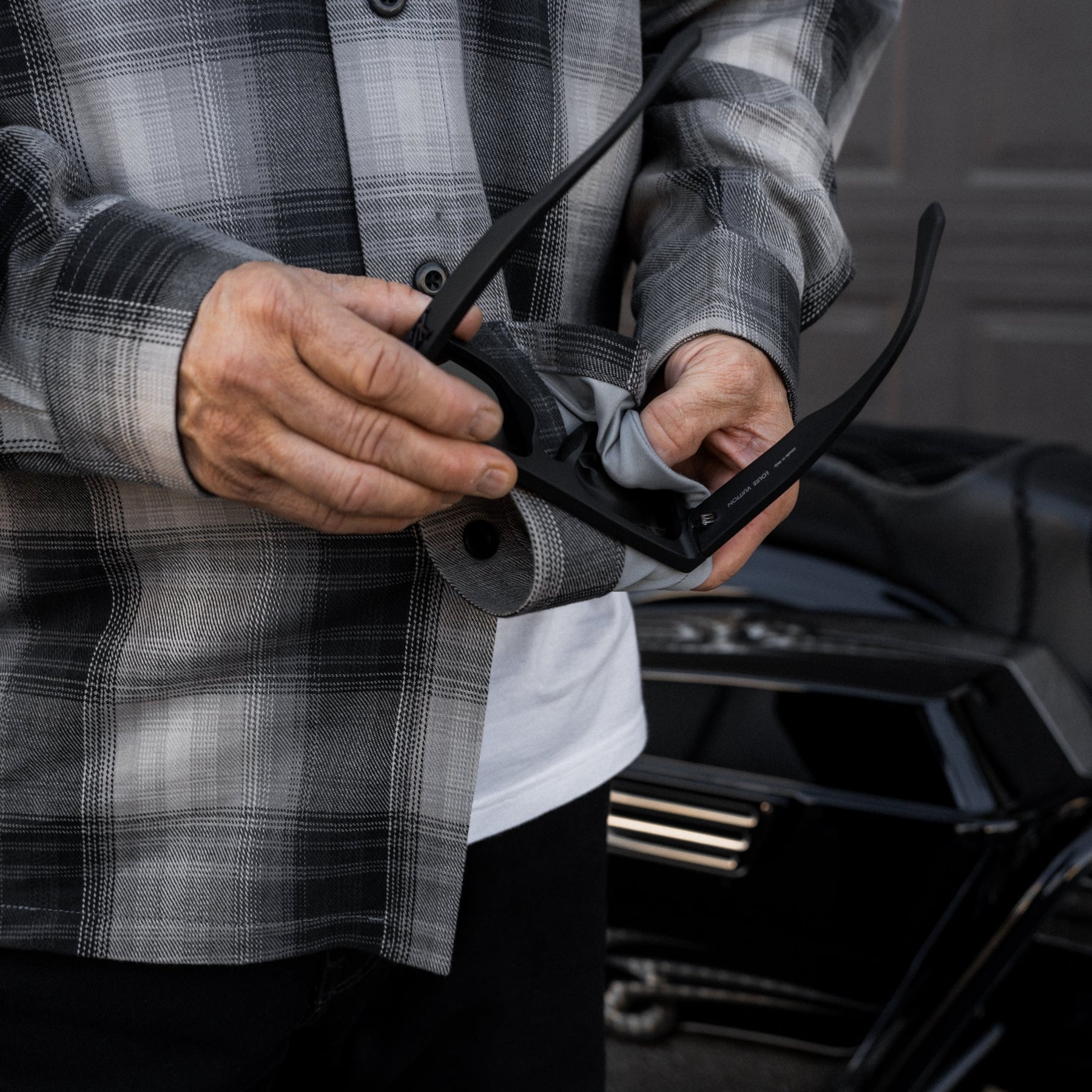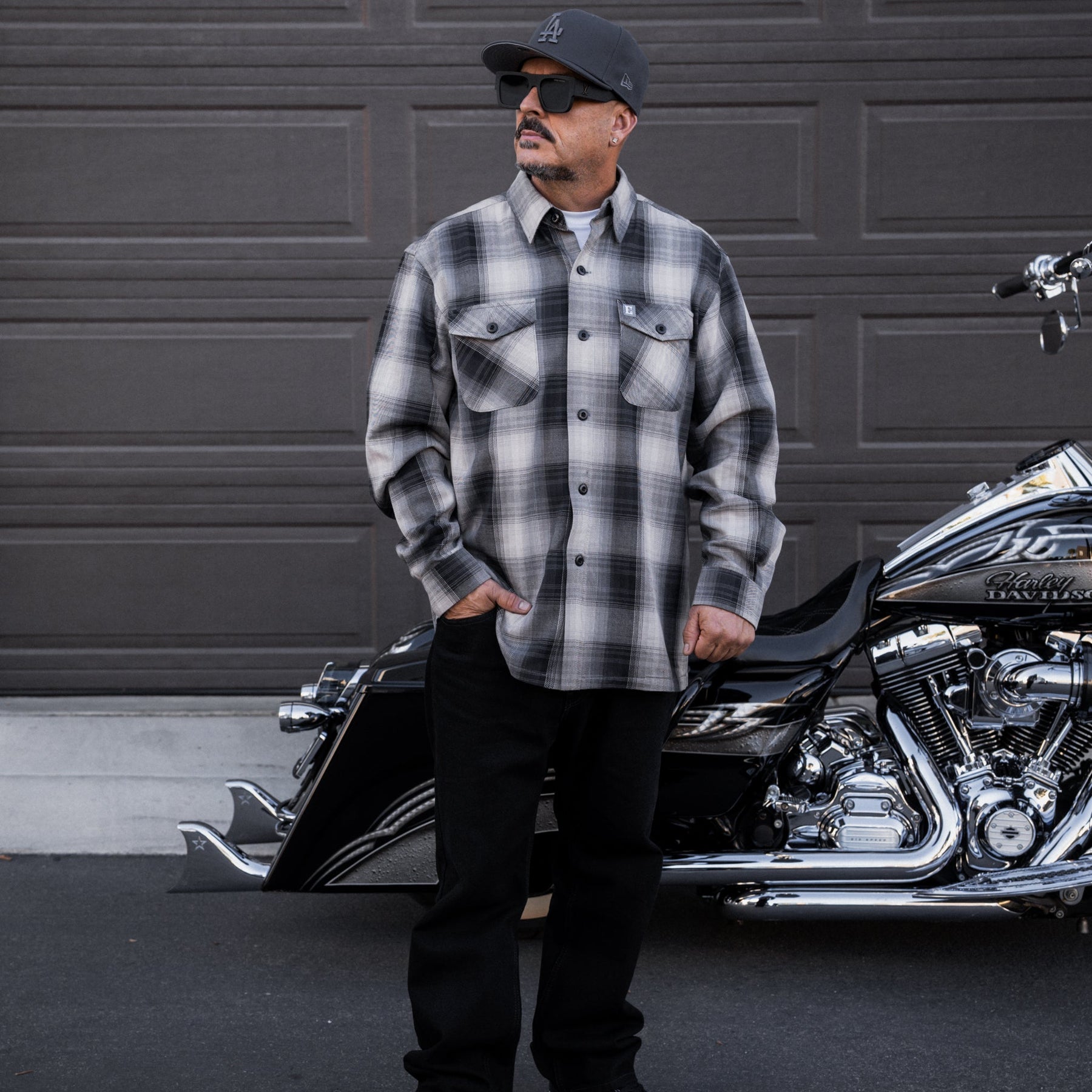 The Men's Black and Gray Shadow Flannel Shirt by Unik Riding Gear blends classic style with rugged functionality. This shirt features a striking black and gray color scheme that complements its robust construction. Perfect for both casual wear and outdoor activities, it combines comfort with durability, making it a versatile addition to any wardrobe.