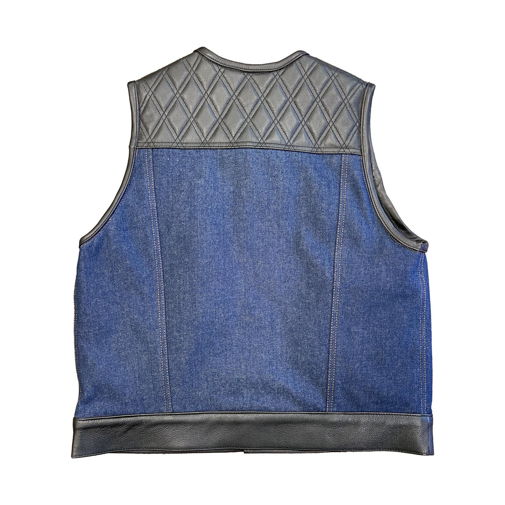 The cowhide leather tops of the "Double Diamond 501 Denim Hybrid Vest" are meticulously selected for their luxurious texture and unique grain patterns. Each panel tells a story of craftsmanship and attention to detail, showcasing a balance between rugged durability and refined elegance. The diamond stitching pattern serves as a focal point, creating a visual contrast that sets this vest apart.